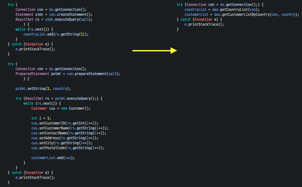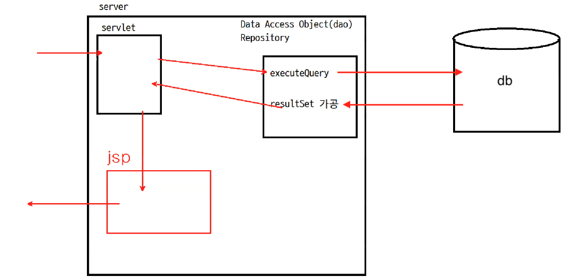 → 아마도 dao 에서 sql 코드, statement, resultset, while 로 리스트에 값 추가까지 다 해서