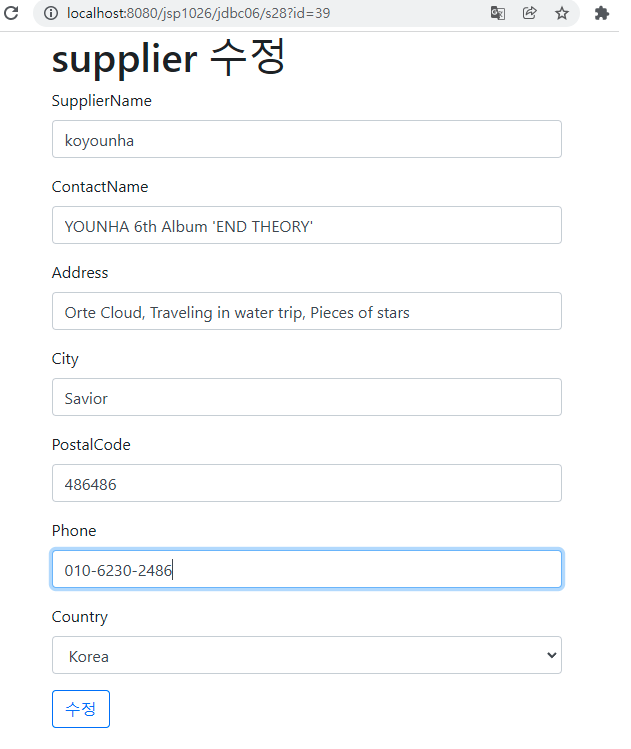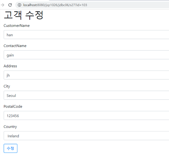 전달받은 id 를 CustomerID 에 저장, selectById → customer, getCountryList → countryList 저장, jsp로 포워딩