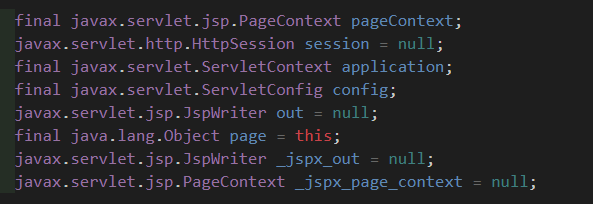 response, request, pageContext, session, application, config, out, page - jsp 교재 114페이지 참고