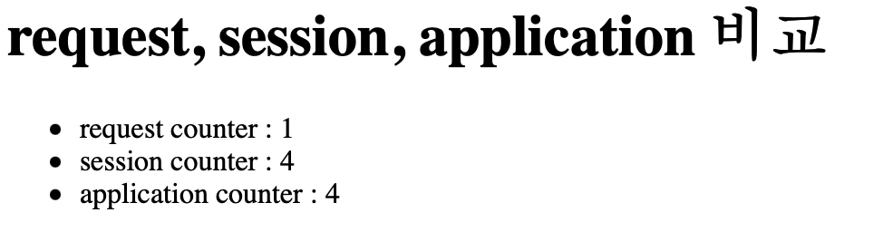 새로고침을 하면 request 는 그대로, session 과 application 은 카운트가 증가한다