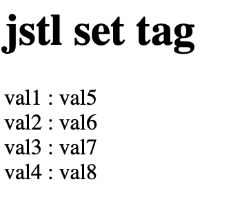 <c:set var="attr5" value="val5" /> - attr5 에 val5 저장