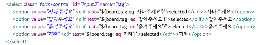 <c:if test="">selected</c:if> 를 option 태그 안에 작성