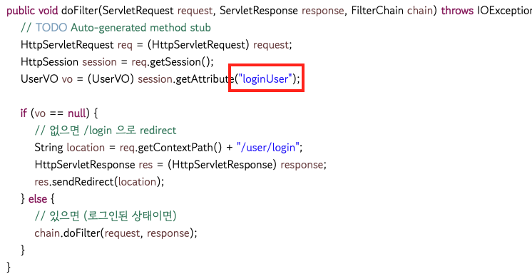CheckLogInFilter 필터 생성, doFilter 다음과 같이 작성