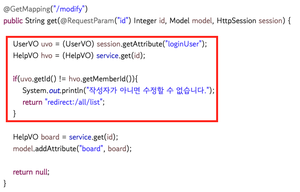 Controller 의 GetMapping("/modify") 의 기존 코드에 위와같이 작성