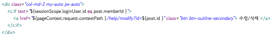test 에서 ${session.Scope.loginUser.id eq post.memberId} 로 로그인한 유저의 id가 게시글의 memberId와 동일한지 확인