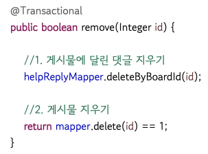 @Transactional 작성하여 댓글을 지우고 게시글을 지우는 작업을 묶어서 한번에 처리하도록 함