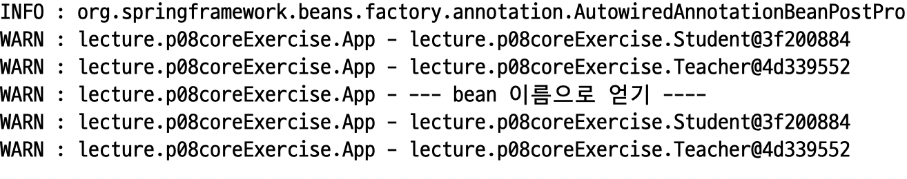 - bean 이름은 클래스 이름 (소문자로 바꾼) 으로 생성된다. 그래서 student, teacher 이 bean 이름인 것.