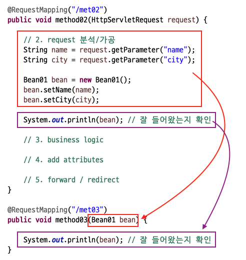 즉, 주소창으로 전달받은 값은 method argument 에서 Bean02 bean 작성하여 bean 에 모두 전달됨