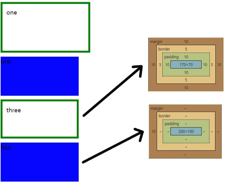 맨 아래의 그림에서 margin, border, padding, content 가 각각 얼마나 차지하고 있는지 표시됨
