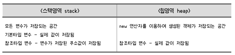 - 변수에 메모리의 주소값 저장 (스택영역에 주소값 저장, 힙영역에 내부 실제 값 저장)