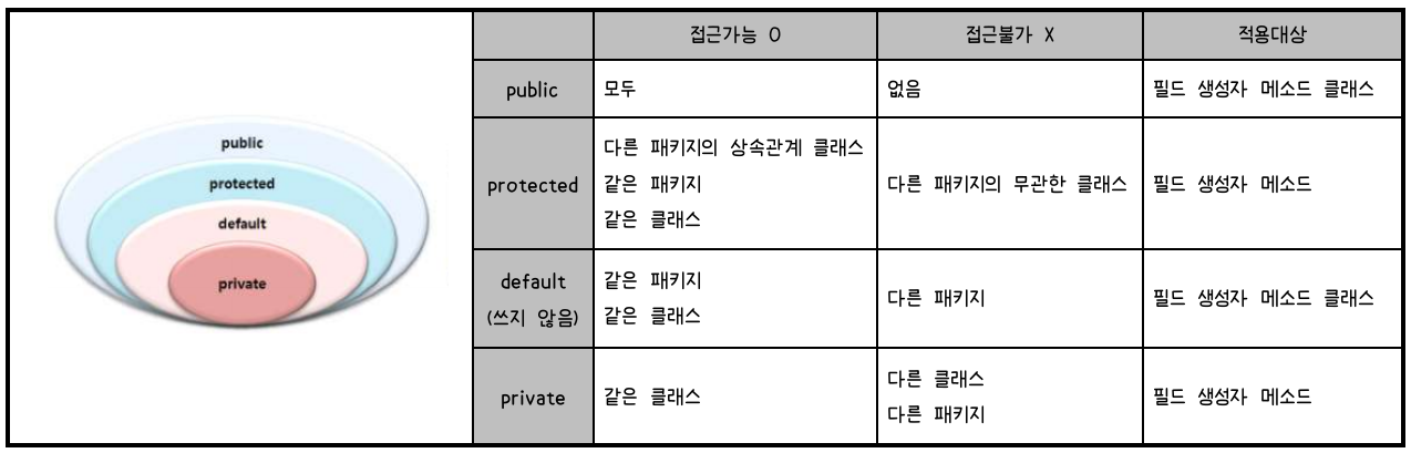 클래스, 멤버변수, 메소드, 생성자로의 접근을 제어할 수 있는 제한자