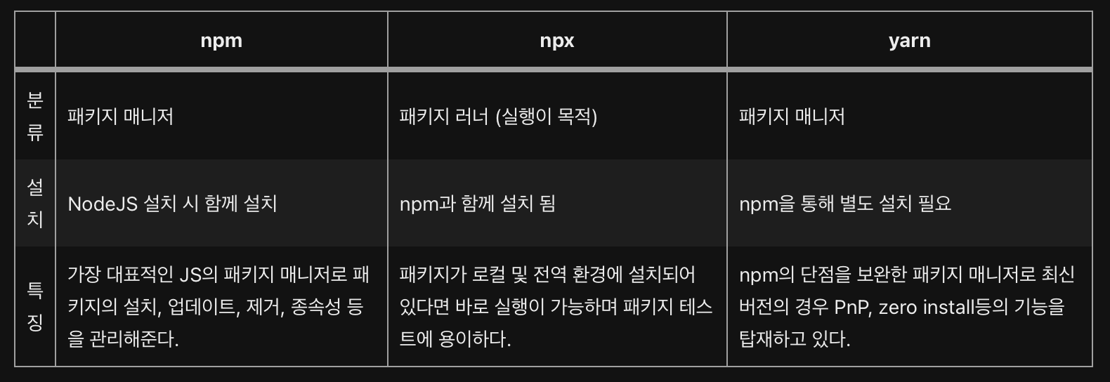 출처: https://velog.io/@sisofiy626/JavaScript-npm-vs-npx-vs-yarn
