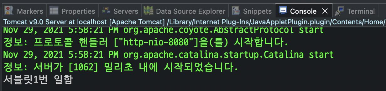 doGet 메소드 내용을 "서블릿1번 일함" 출력하는 걸로 바꿈